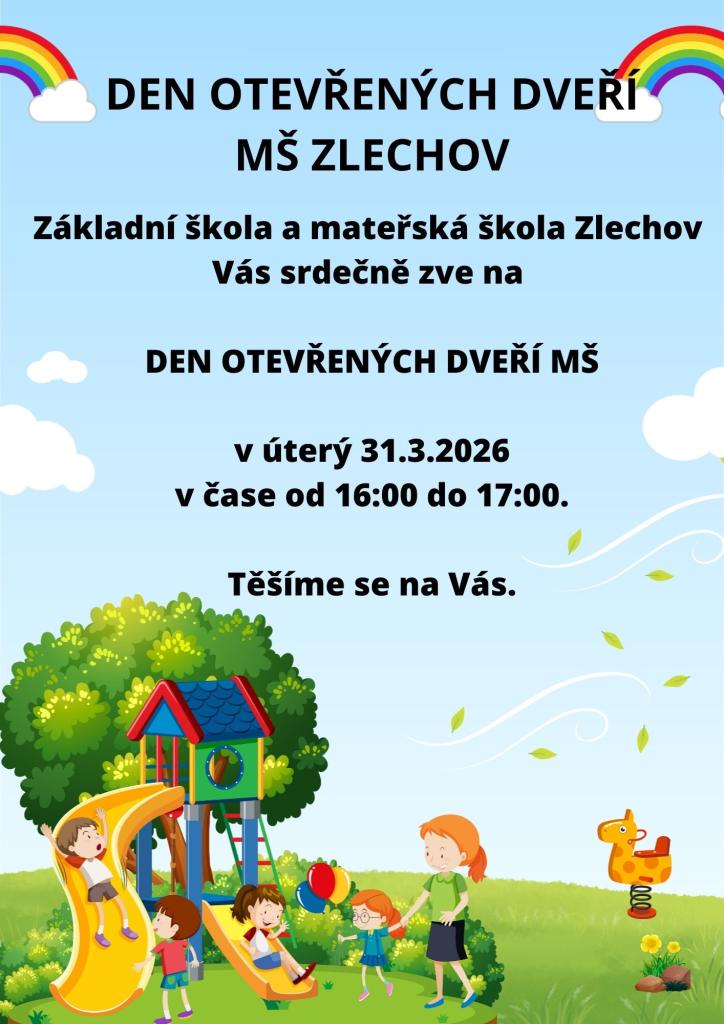 Pokud byste se rádi seznámili s prostředím naší MŠ ještě před zápisem, rády Vás a Vaše děti provedeme třídami v rámci Dne otevřených dveří, který se uskuteční 31.3.2026 v čase od 16:00 do 17:00.