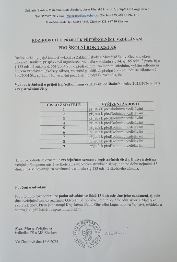Zápis do MŠ Zlechov pro školní rok 2025/2026 proběhl dne 14.5.2025 v budově mateřské školy. Rozhodnutí o přijetí / nepřijetí k předškolnímu vzdělávání naleznete v příloze.